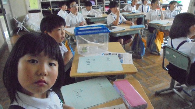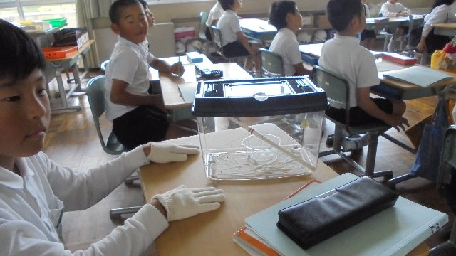 理科で3年生が青虫からチョウへと飼育観察しています。羽化したチョウに蜜をやって元気になったら放しています。命を大切にしていてすばらしいですね。道徳教育にもつながっています。