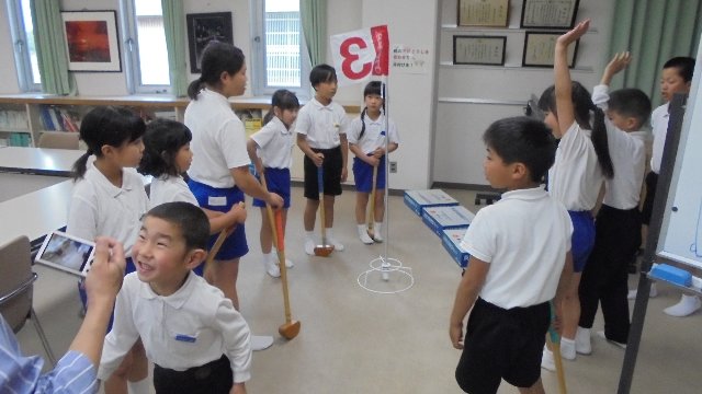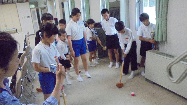 今日の児童会主催「なかよし班クイズラリー」では、飛び入りのアトラクション、ボーナスステージとして「グランドゴルフ」のコーナーが設けられました。場所はなんと会議室。どんなコースだったか聞いてみて下さいね。