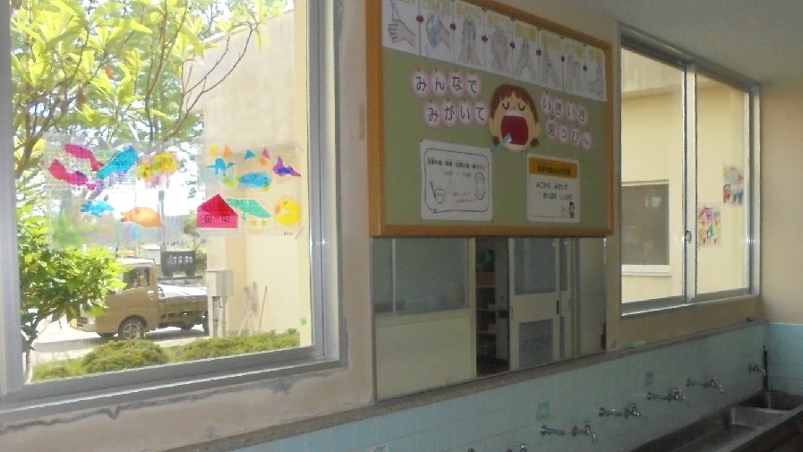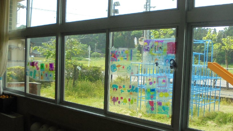 図工の作品が仕上がりました。教室にも飾りましたが、手洗い場のガラスにも。なんという作品なんでしょうか、聞いてみて下さいね。光を背に受けてとてもきれいです。