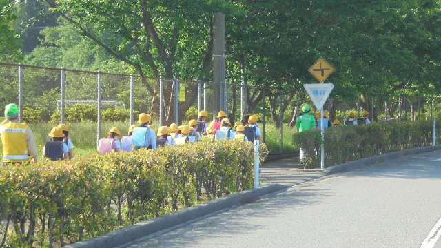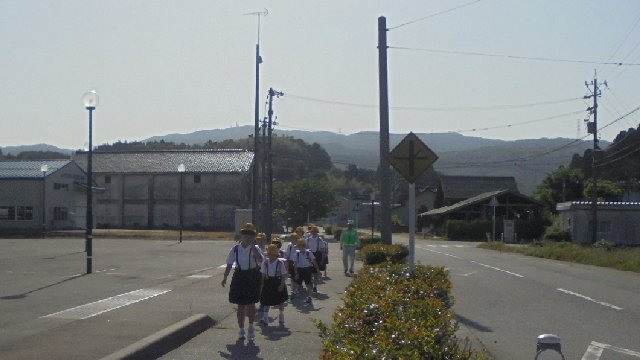 最近、集団登校がかたまって登校しています。以前は早くに到着する班と遅めに到着する班がありましたが、ひとかたまりになっています。瀬戸町と八野もかたまっています。サルの出没をを警戒しています。