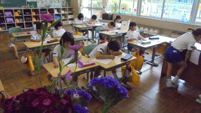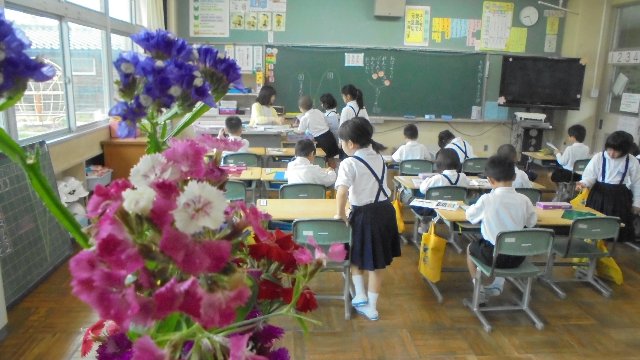 玄関のプランターの花を少しずつ切って、通りかかった子どもたちに手渡しました。教室の花瓶に飾ってくれました。花がある教室は心が和みます。昨年、たくさんの子どもたちが家から花を持ってきてくれました。今年もどうぞよろしくお願いします。