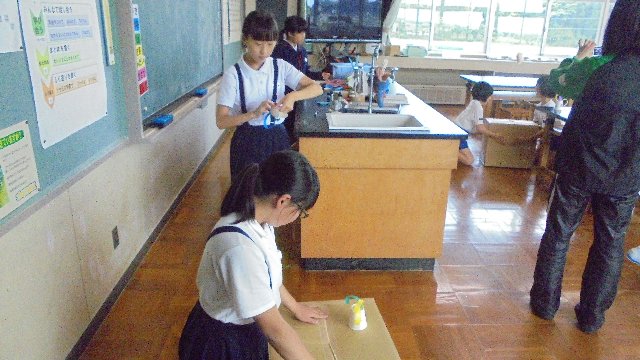 理科室から歓声が聞こえてきます。科学クラブが楽しい実験をしています。段ボール箱を使った「空気砲」です。クラゲの紙コップが見事に打ち上げられる度に大きな歓声が沸き起こっていました。