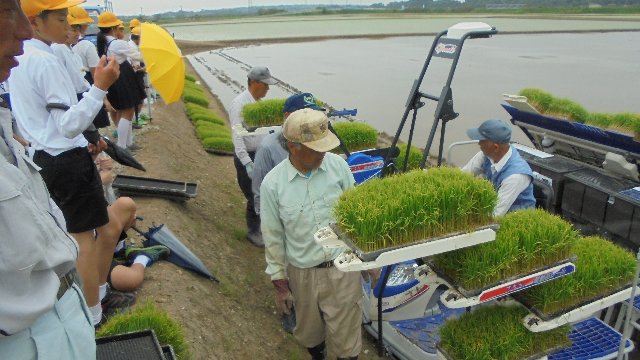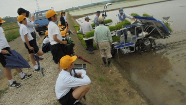 昨年から学校の近くで田の整備工事が始まり、今春初めての田植えがありました。5年生が社会科では食料生産、総合では米づくりを学習しているので見学に行きました。