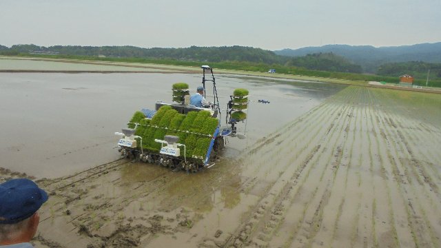 びっくり!一体どれだけの広さがあるのでしょう。向こうの土手が見えますか!?先日自分たちが田に入って手で植えたの【こちらも】のと比べようがないくらいスケールの大きさでした。