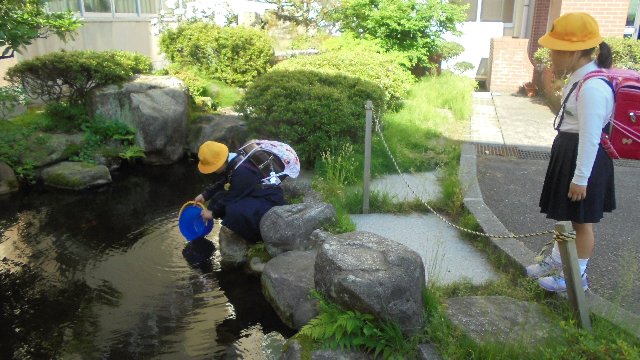5年の酒井さんがバケツを持って登校、中身は家で飼っている金魚を4匹も持ってきてくれました。学校の池の金魚が春先に鳥に食べられ1匹だけになりさびしそうだったから。優しいですね。ありがとう。
