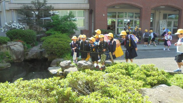 下校時、子どもたちが池の前に集まっています。池にすむメダカが顔を出しています。久しぶりの対面というところでしょうか。