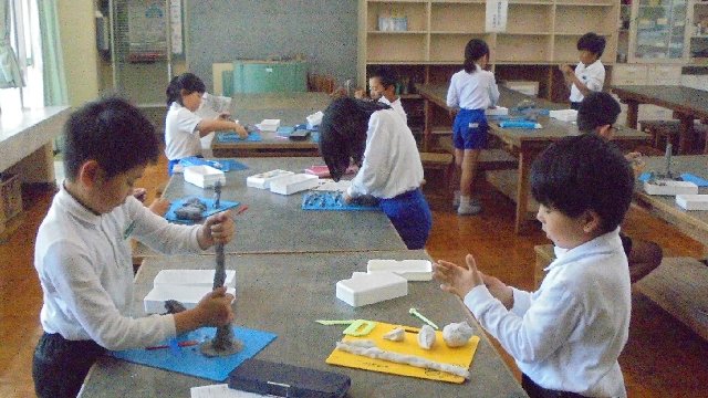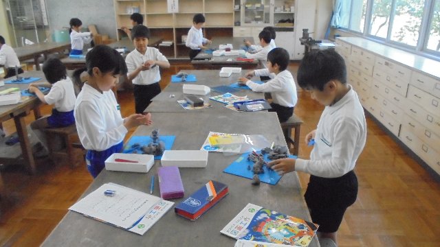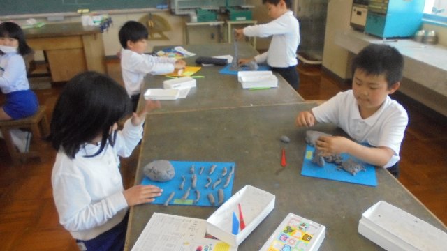3年生がいろいろな形を粘土で表しています。何を作っているのでしょうね、興味津々。できあがったら互いに発表するそうです。