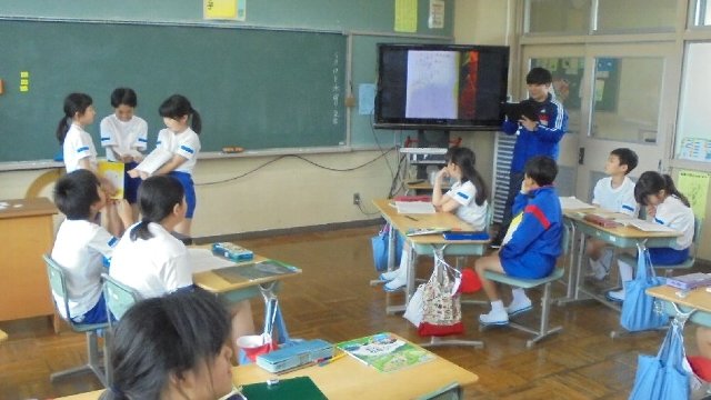5年生が社会科の調べ学習の発表をしています。堀田先生の手には、iPadが。子どもたちのノートを大型テレビに映し出しています。教育効果が上がります。