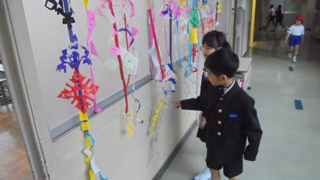 学校にどんな部屋があるか探検しています。図工が大好き、作品にご満悦。