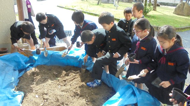 写真の4年生は何を植えたのでしょう。種は家にも持ち帰りしたそうです。比べて観察すると楽しそうです。玄関にも他の学年が植えた鉢が並んでいます。芽が出たらお知らせしますね。