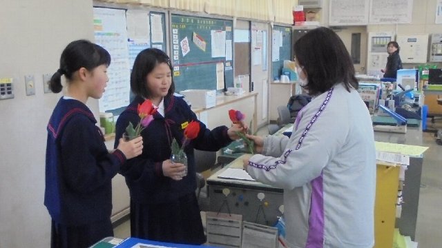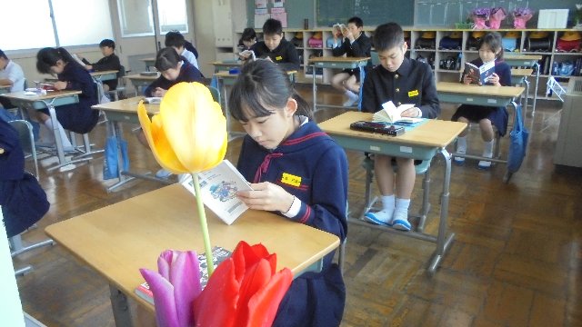 2018年4月16日 10時00分 朝から各教室に切り花が配られました。昨年の秋にちょこボラで植えたチューリップの花を切り花にしてさわやか委員会のメンバーが各教室だけでなく、図書室や職員室にも持ってきてくれました。きれいな花といっしょに1週間がスタートできます。ありがとう。