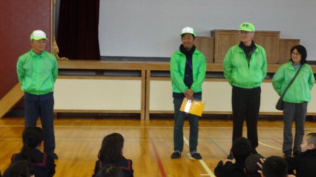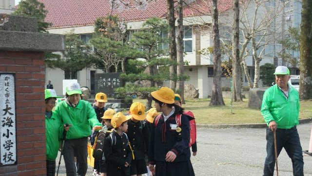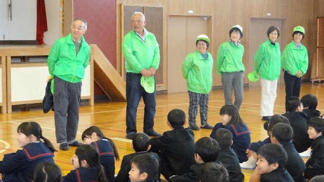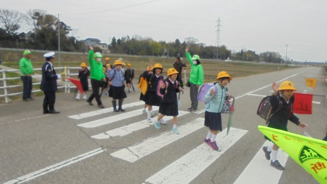 昨日から1年生の給食が始まり、午後から集団下校の指導をしました。初回なのでこれから毎日お世話になる防犯ボランティアのみなさんとの対面式も行いました。