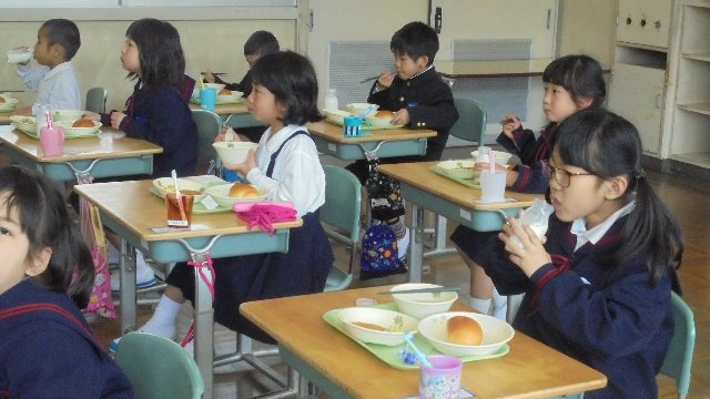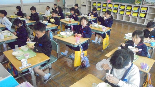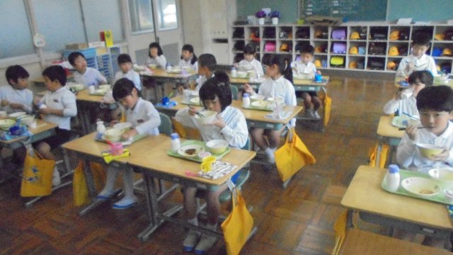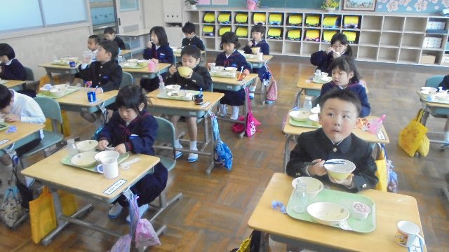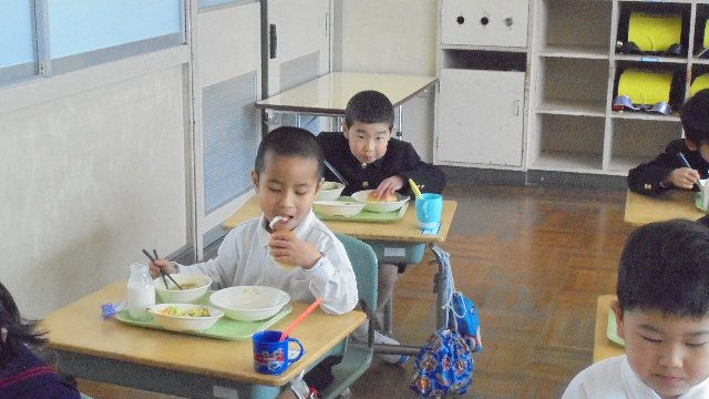 1年生の給食の様子です。おいしそうに食べていますね。