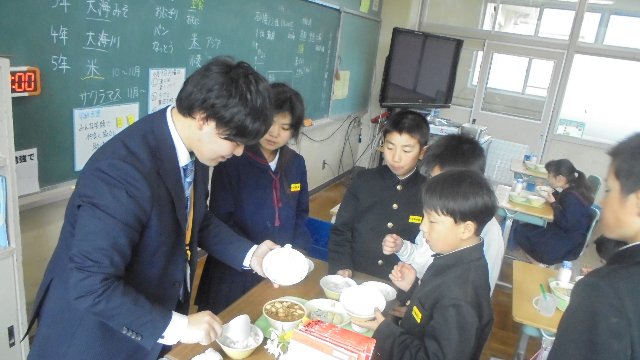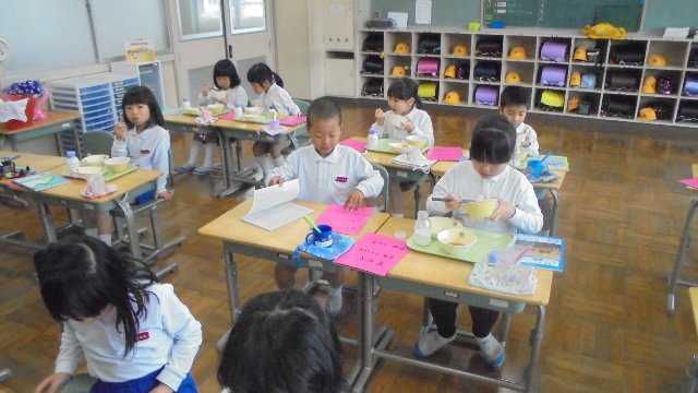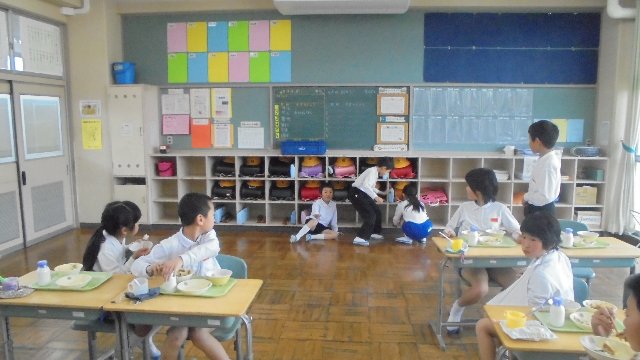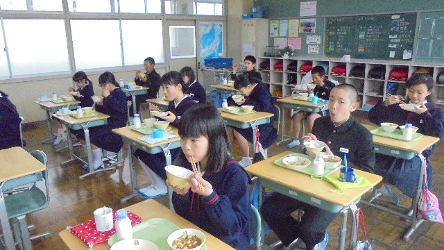 1年生は今日から給食ですが、2年生以上はすでに食べています。教室をのぞいてみると担任に大サービス、すごい大盛りでした。さすがに堀田先生もギブアップ子どもたちの希望者に分けていました。