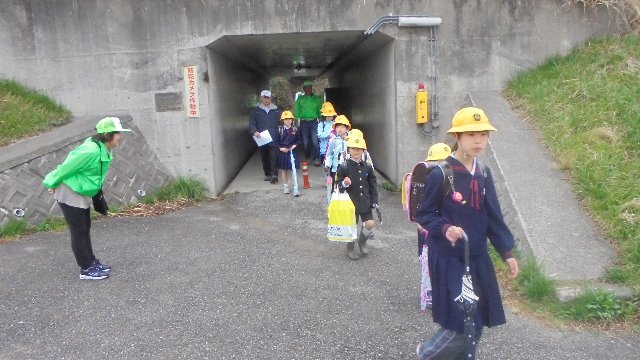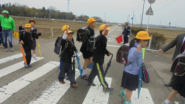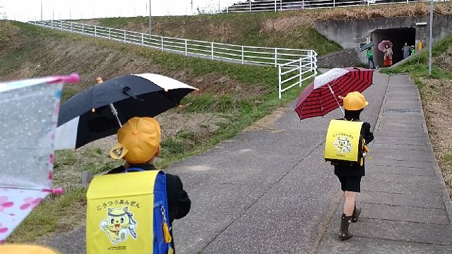 今朝の登校、1年生は初めての集団登校。優しい上級生が前からも後ろからもサポートしてくれます。