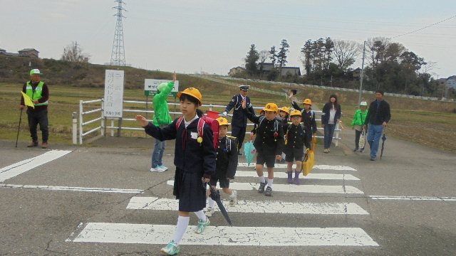 地域の方にもたくさんの見守りに参加していただいています。パトカーも参加。
