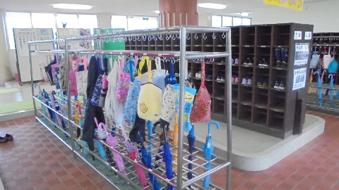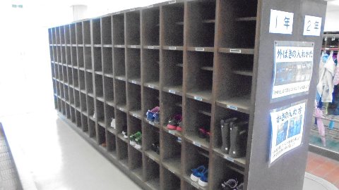 新学期の玄関下足箱です。新入生のはき物はきちんと並んでいるかなと見てみると、朝から上級生に誘われて外へ出ていて外履きがありませんでした。