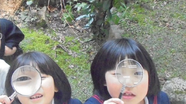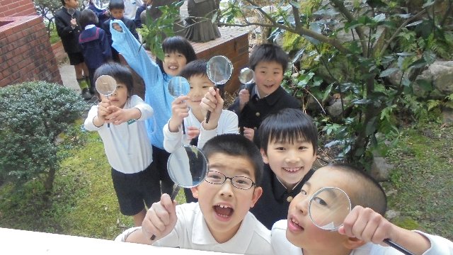 2年生が外で大きな虫眼鏡を持って・・・何を探しているの、ひょっとしたら春探し!?うれしそうですね。太陽は見ないでね。