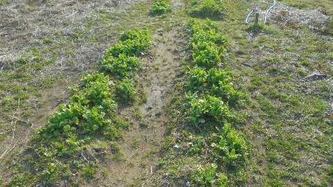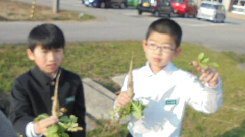 秋に植えたダイコンが育っています。長い間雪の下になっていたので様子がわかりませんでしたが、ご覧の通りです。朝の会で紹介されました。どこまで大きくしてから食べようかな。