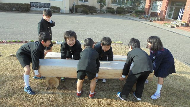 朝学校へ来たら、たいへん!前庭のベンチが1つ消えています。くっきり後だけ残っています。誰が持って行ったのだろう?子どもたちは、持ち上げることができるか試しています。かわいいですね。しかし、なぞです。区長さんが自分の地域へ運んだのだと思うのですが、どこへ?