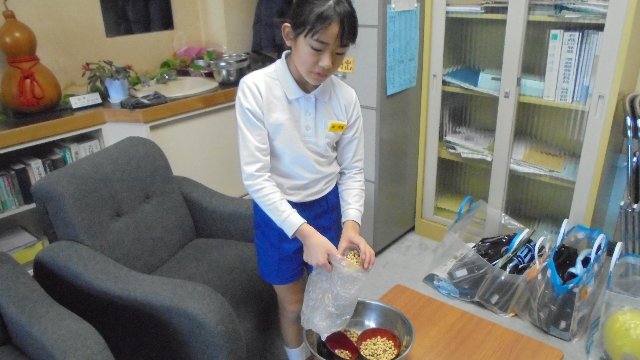 学校で3年生が収穫した大豆を希望者に配りました。味噌づくりではぶかれた豆で色の悪いものも混じっていますがご了解下さい。どうぞ豆まきにお使い下さい。