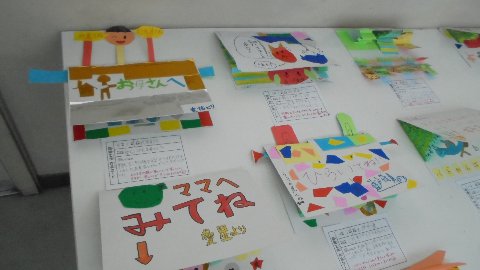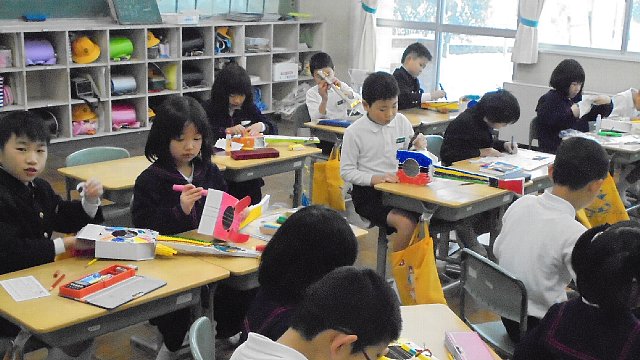 朝の各教室は、何やらいそがしそうでした。午後からお家の人に図工などの作品を見てもらおうと、仕上げを急いでいました。写真の2年生の楽器は本物と同じように音が出るのですよ。いろいろな音を工夫して出るようにしたんですね。