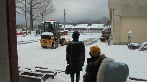 早朝より地域・保護者の方に除雪していただきました。瀬戸町の髙﨑さんの素晴らしいロードローラーの操作ぶりに子どもたちも見入っていました。「将来、運転手になりたいな・・」こんな声も聞こえてきました。
