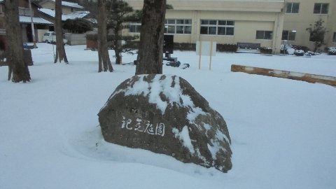 中庭の石がこんなのになりました。ちょうど刻まれた字のところだけに雪が入り込んで、白く浮き上がっています。子どもたちは何でも見つけますね。