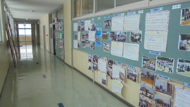 3階廊下、今年1年の特別活動行事などの写真が展示されています。音楽室につながる廊下です。土曜はここもチェック!もちろん職員室前のコミスクコーナーと3階地域交流コーナーも。