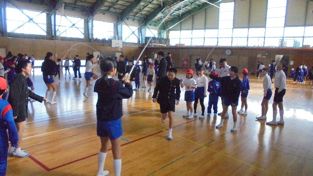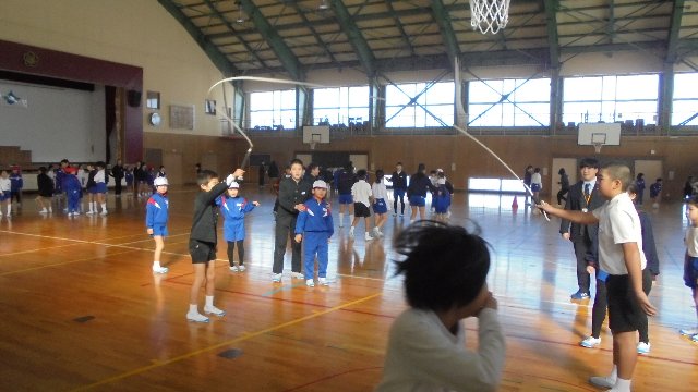 体育館に全員集合して長なわをしました。高学年が低学年に跳び方のこつを教えてあげる・・・とってもいいことです。写真は、5年生の中田さんが1年生の西盛さんの肩に手をかけてタイミングを教えていますね。すばらしい。