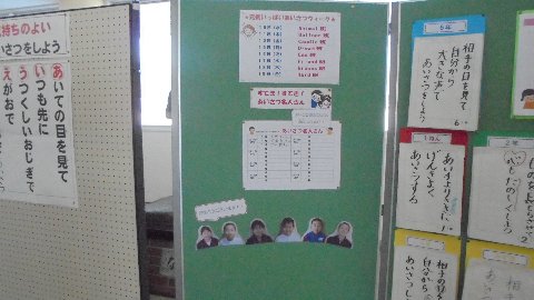 毎朝あいさつ運動をしています。その日のあいさつ名人を昼の放送で発表しています。今回からその名人の顔写真を玄関に掲示しています。このコーナーが子どもたちの明るい顔でいっぱいになるといいな。今日も3人増えていました。誰が載っているかお聞きになって下さいね。