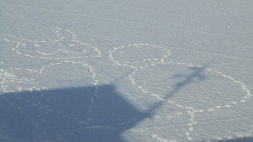 よく目をこらして見ると、足跡が不自然です!誰が描いたのか運動場に足跡でかわいらしい絵が。上手ですね。