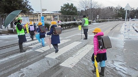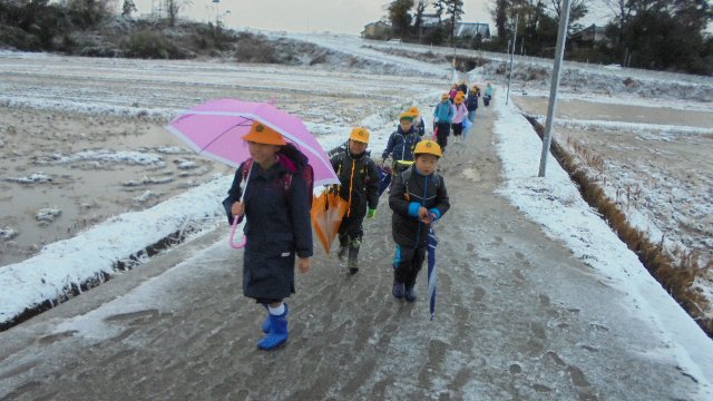 朝の登校、天候が悪くなり歩きづらい日が続いています。身を寄せ合って、高学年が低学年をかばい協力して登校する姿はほほえましいものです。集落から抜けて、写真のこのあたりが吹きさらしで一番の難所です。学校に到着するとほっとします。