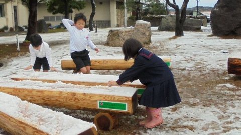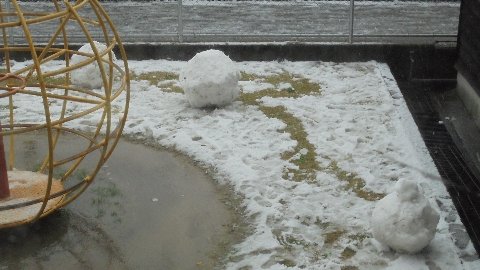 いよいよ本格的な冬将軍の到来です。昨夜から降り積もったあられ混じりの雪に子どもたちは大喜び。少ないけど外で遊んでいます。元気ですね。ほら、いつの間にかこんなに大きな雪だるま!いったいどこから集めたのでしょう(笑)