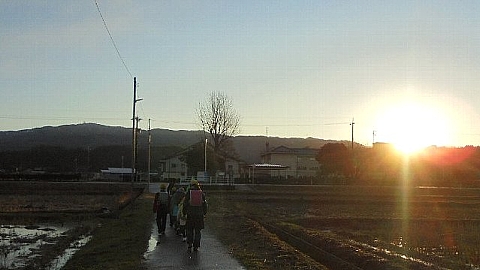 12月1年で一番日の出が遅い季節です。子どもたちは、ちょうど山際から昇る朝日と同じ頃に登校しています。晴れた日は校舎から陽が差しまぶしいです。