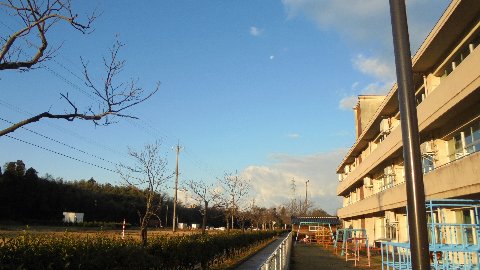 2017年12月7日 17時04分12月1年で一番日の出が遅い季節です。子どもたちは、ちょうど山際から昇る朝日と同じ頃に登校しています。晴れた日は校舎から陽が差しまぶしいです。