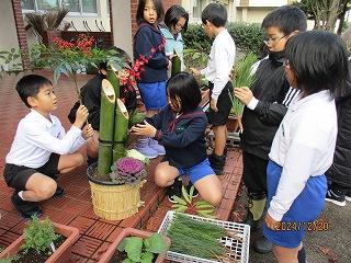 2.3年生が道原さんと一緒に門松づくりをしました。最初に門松の意味を教えて頂いてから、みんなのところに「福が来ますように」と願いを込めながら作りました。