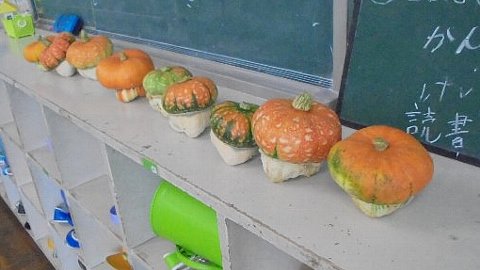 教室で面白いものを見つけました。もうすぐハロウィーン、ぴったりですね。お化けカボチャになる予定だったのが、下にふくらみました。どうしてこんな面白い形に育ったのでしょう・・・まるでUFO。
