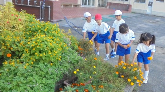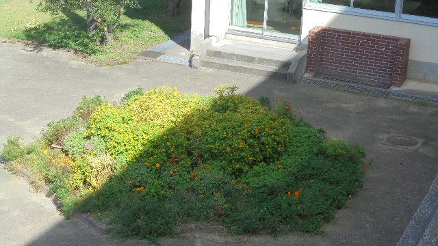 2017年10月5日 12時16分 夏の花々が咲いています。10月になっても満開です。今月27日はたくさんのお客さんがおいでます。その日に向けてもう一花咲かせてほしいと願い、今咲いている花を刈り込みました。1年生がちょこボラしてくれました。うまくもう一回咲いてくれるといいな。
