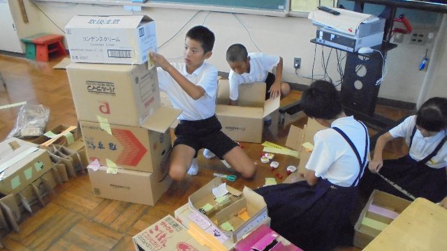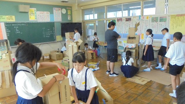 4年生がたくさんのダンボールを使い、スケールの大きな作品を作っています。