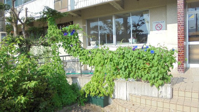 体育館前のアサガオ、大きくもさもさ?になりました。最初「馬」に形が似ていると思いましたが後ろ足が足りませんでした。「校長先生、恐竜みたい」と言ってくれる子どももいました。ところどころ咲き始めています。全面が花で満開にならないかなと期待しています。朝一番でないと見られないのでしょうね。