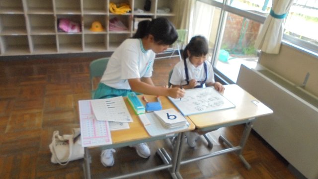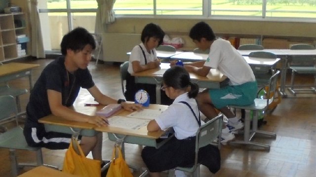 今日のサマースクールは、ゲストを迎えました。卒業生、中3のお兄さんお姉さんが勉強を教えに来てくれました。午前中各教室に分かれてミニ先生をしてくれました。年が近いせいかすぐ仲良くなって勉強できました。