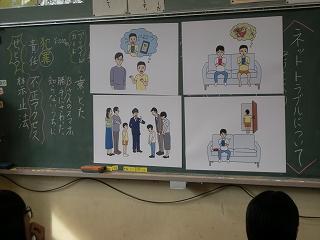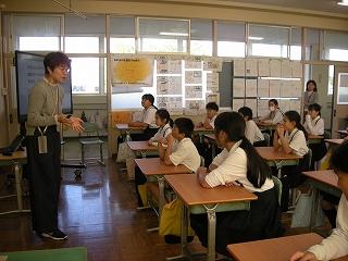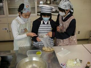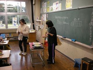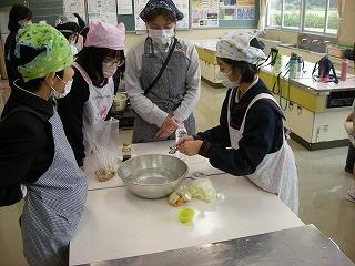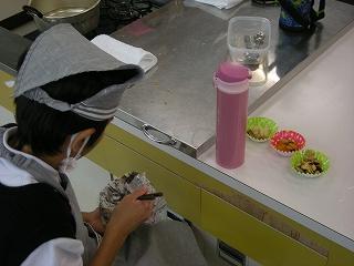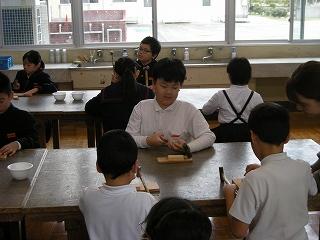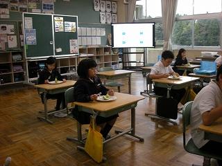 5,6限目に県栄養士会の橋本先生から防災への心構えや簡単に作れる防災食、新聞紙で作る器の作り方などを教えていただきました。「簡単に作れる」とはいうものの、子どもたちにとっては初めての経験なので、先生方に手伝ってもらいながら作っていました。出来上がった防災食は予想以上においしくできて、食べているときは皆笑顔でした。