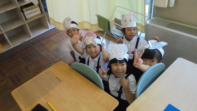 1年生の教室をのぞくと、みんなが頭にお面をつけて劇の練習。おじいさんやおばあさん、ねずみなどの動物もいて、楽しそうです。おや、大きな白いごみぶくろは何なんでしょう。あれですよね、あれ。