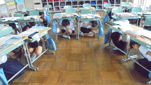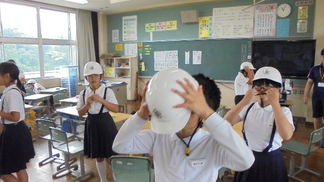 午前11時ジャストかほく市の防災無線の拡声器から地震を知らせるアナウンスが・・・学校でもすかさず校内放送。各教室ではご覧の通り机の下で机の脚を握りしめ自分の身を守りました。各教室に備えられているヘルメットもかぶってみました。