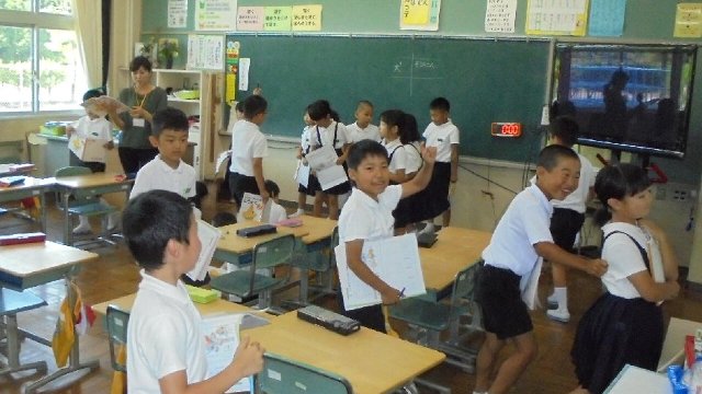 2年生の教室をのぞくと、道徳の本を手にグループで集まってなにやら話し合っています。「好きな食べ物は・・・」「ぼくといっしょだ。」相互理解によってもっと友だちと仲良しになろうという取組です。自分と同じ人がたくさんいましたか?
