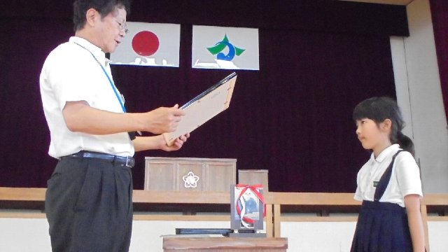 少し日がたってしまいましたが集会で話し方大会に出場した大野さんの表彰をみんなの前でしました。