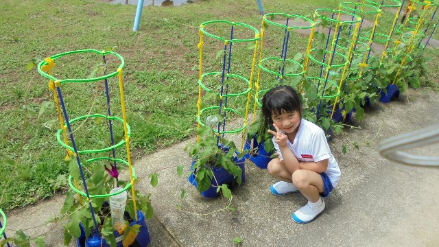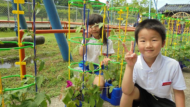 1年生のアサガオが咲き始めました。つるが支柱からはみ出すほど元気です。これからどんどん咲きそうです。満開になる頃夏休みでしょうか。