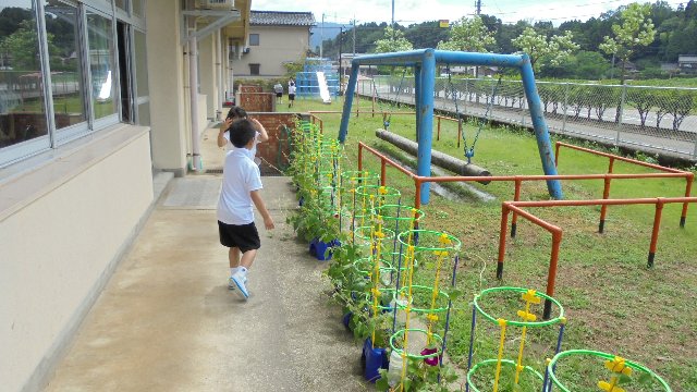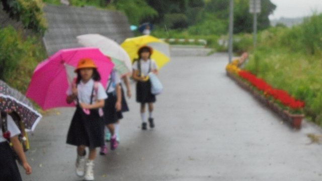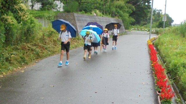 大雨・雷・洪水注意報の中、今日も元気に登校しました。登校時は幸い雨が小降りで傘をさしていない子も見受けられました。子ども達の登校する道の脇には、今年も中沼の子ども会や地区で世話をしているプランターの花がきれいに咲いています。