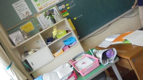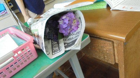 梅雨にふさわしく、今朝は2年生の竹本さんが家からアジサイの花を持ってきてくれました。たくさんあったので、今日は1年教室と職員室におすそ分け。ありがとうございました。